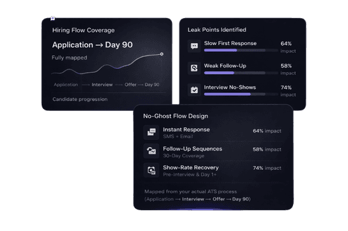 We map your process from application to Day 90, find where candidates leak (slow responses, weak follow‑up, no‑shows), and outline your No‑Ghost flows.